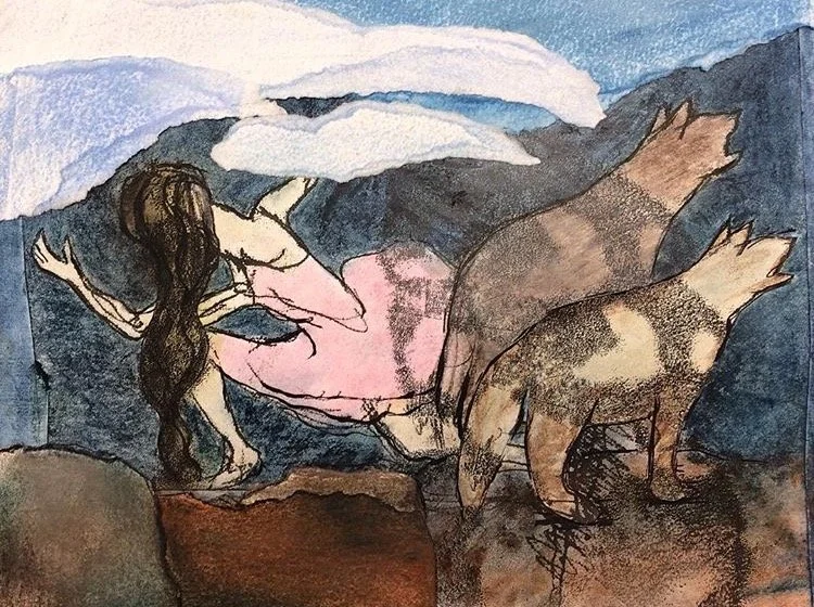 “Dancer with Her Head in the Clouds”, and variations on this theme, is a motif in my work that finds its way across all mediums.