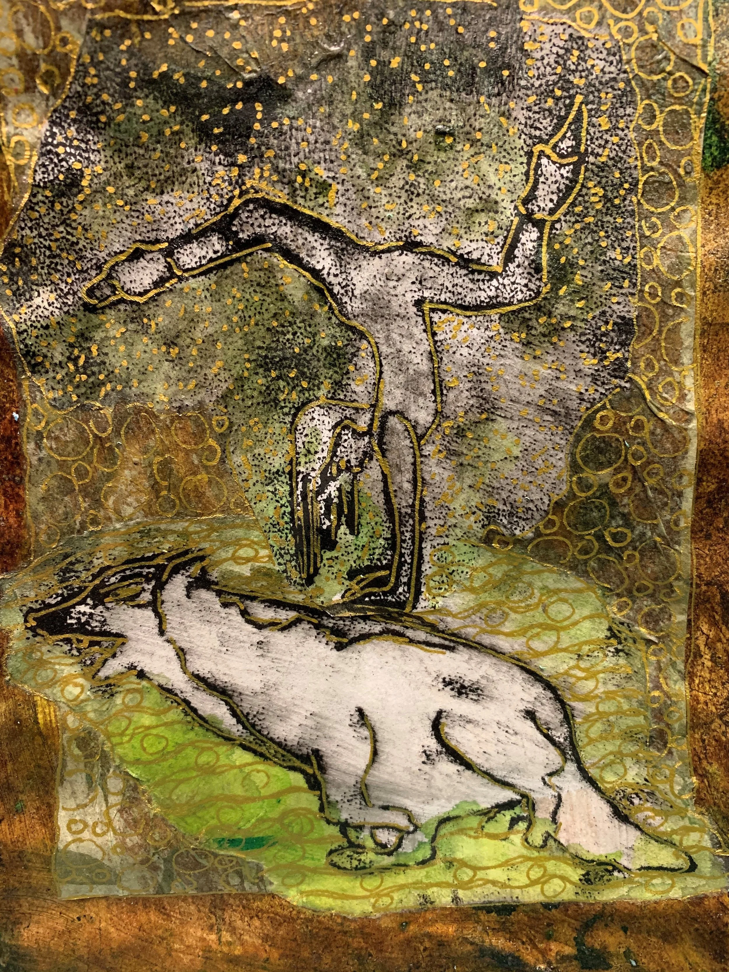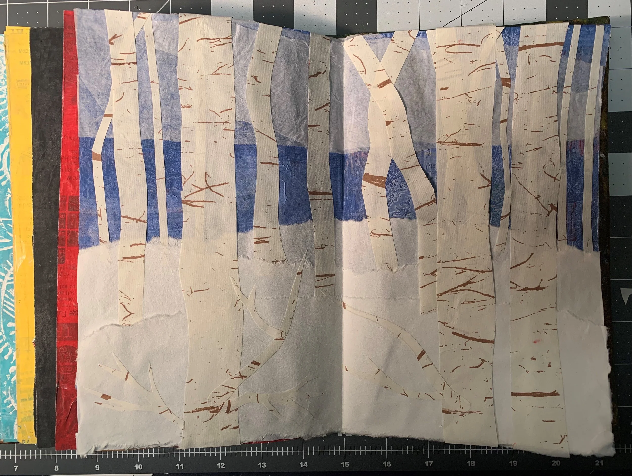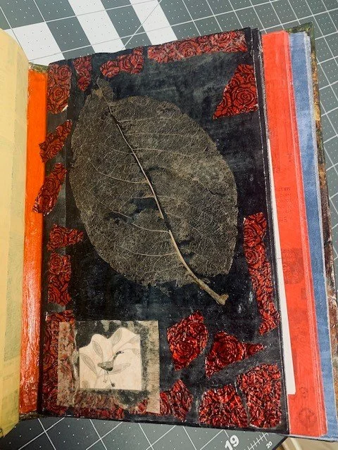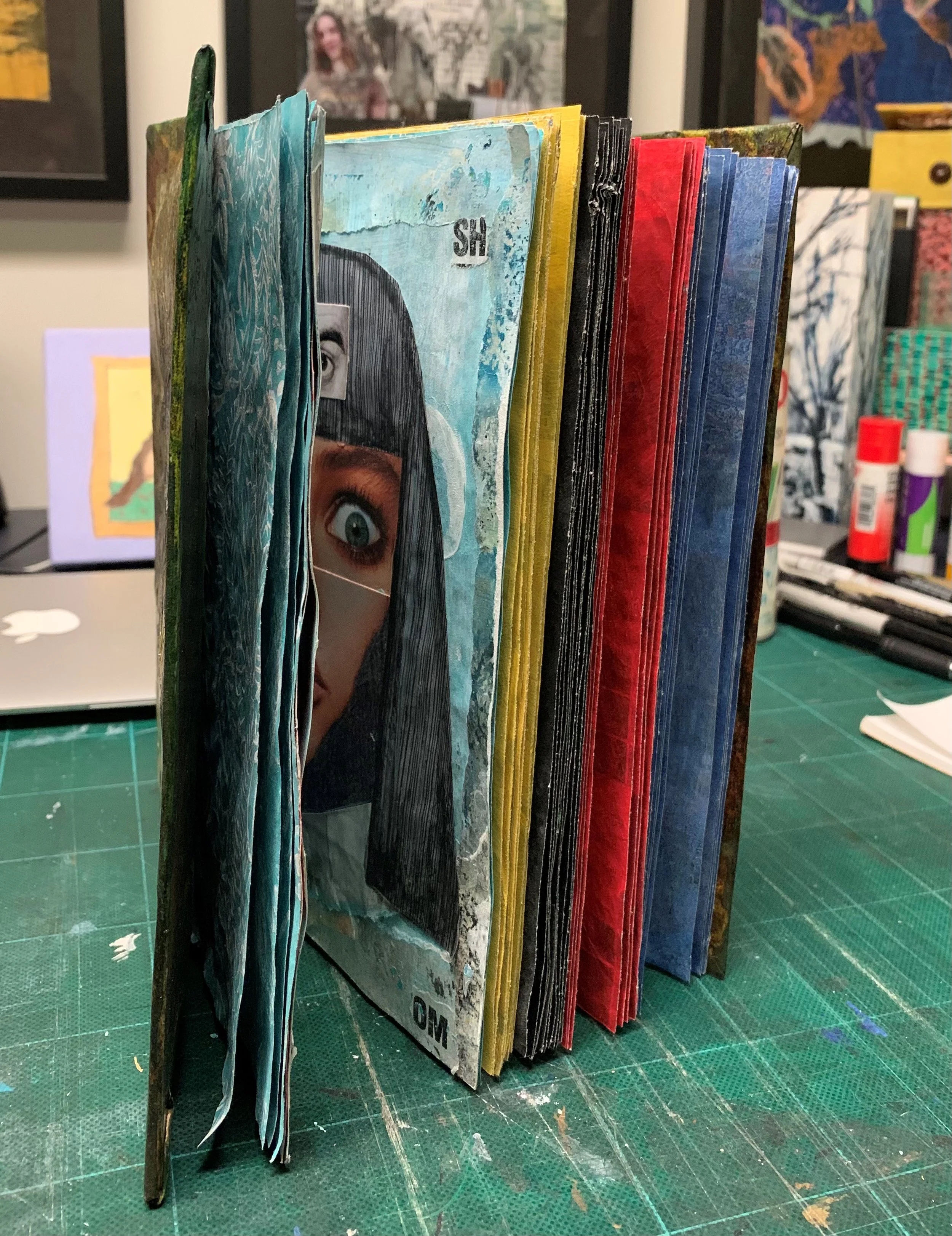 I made this junk journal from a used cracker box. It’s pages are filled with unconnected mixed media pieces made from upcycled materials. It also has secret pockets for lesson plans, and surprises.